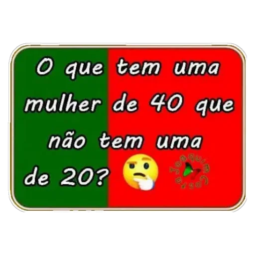Una figurita con fondo dividido en verde y rojo, con texto en portugués que pregunta sobre la diferencia entre mujeres de 40 y 20 años. Acompañado de un emoji de cara pensativa.