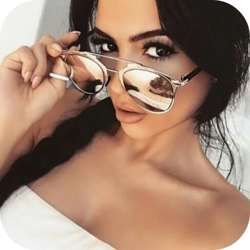 Mujer con gafas de espejo, cabello oscuro y maquillaje, tocando sus gafas con la mano.