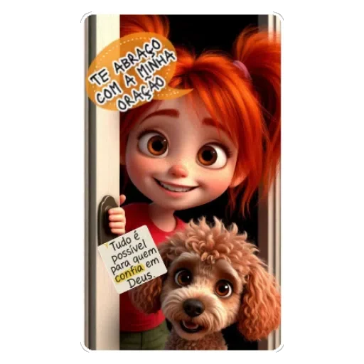 Niña de pelo rojo con un perro, sosteniendo un papel con texto ilegible. Ella dice 'Te Amo' con un corazón.