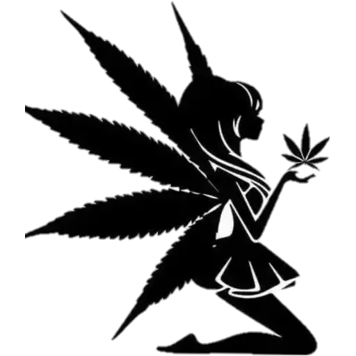 Silueta de una mujer con alas de hoja de marihuana, sosteniendo una hoja de marihuana.