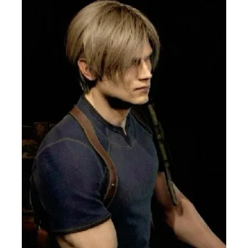 Personagem de jogo com cabelo loiro curto e expressão séria, vestindo uma camisa preta e alça de couro.