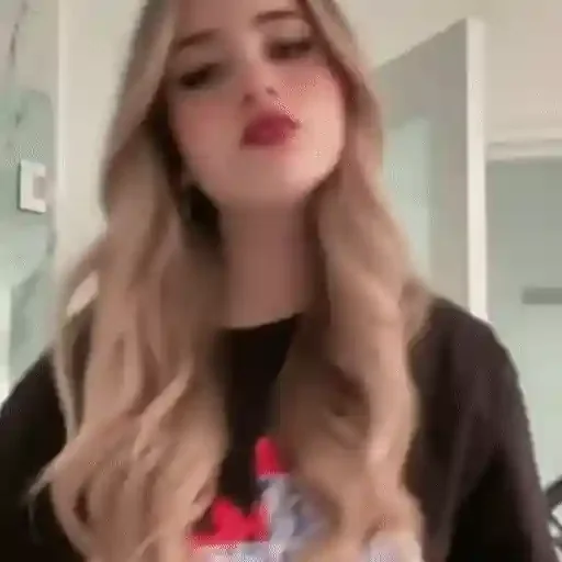 Una joven mujer rubia con los ojos cerrados y una expresión serena, vistiendo una blusa negra con detalles en rojo y gris.