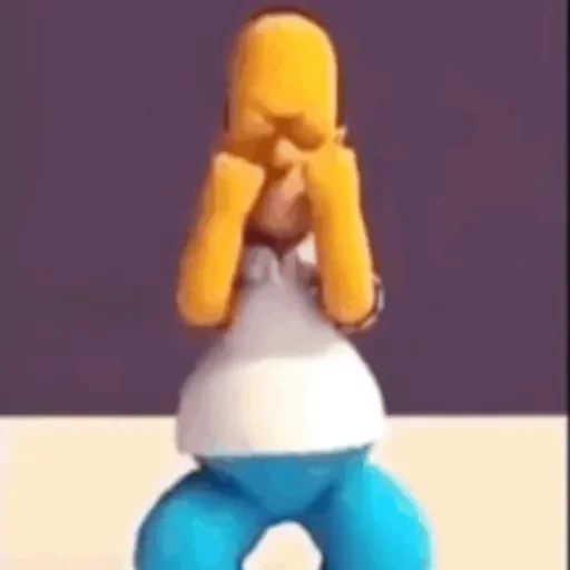 Homem de aparência amarela e rechonchuda, com olhos grandes e expressão confusa, vestindo uma camisa cinza e calça azul.