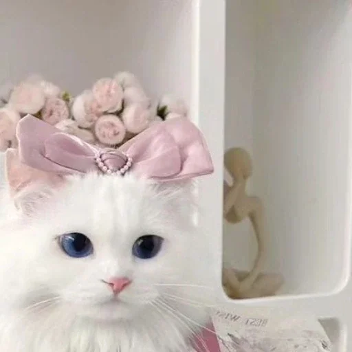 Gato blanco con ojos azules y un lazo rosa en la cabeza, adornado con flores rosas. El gato tiene un hocico rosa y está en un ambiente con decoración blanca.
