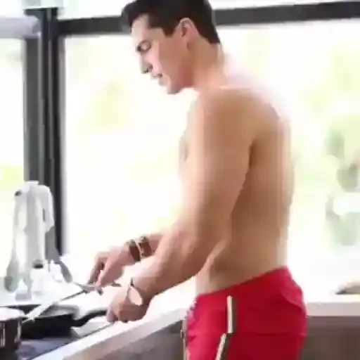 Hombre sin camisa, con shorts rojos, preparando comida en la cocina.
