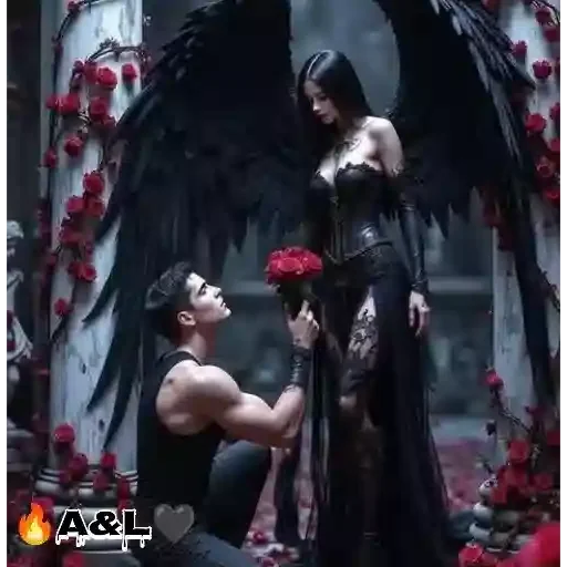 Un hombre musculoso vestido de negro ofrece una rosa roja a una mujer con alas de ángel negras y cabello oscuro, vestida con un largo traje negro. El fondo es oscuro con rosas rojas.