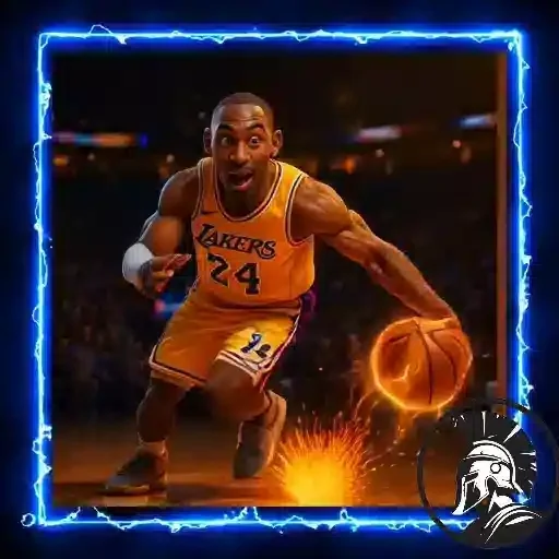 Un jugador de baloncesto profesional con una camiseta naranja número 24 regatea un balón de baloncesto en llamas, con un contorno de luz azul y un logotipo de guerrero en la esquina inferior derecha.