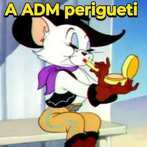 Un gato de dibujos animados aplicando maquillaje con un pincel, con un look atrevido y una expresión de concentración. La leyenda 'A ADM perigueti' aparece encima.