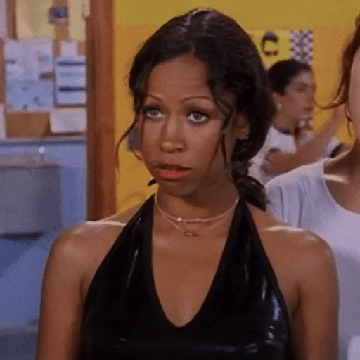 Mujer con expresión de sorpresa o confusión, vestida con un top negro, con otras personas de fondo.