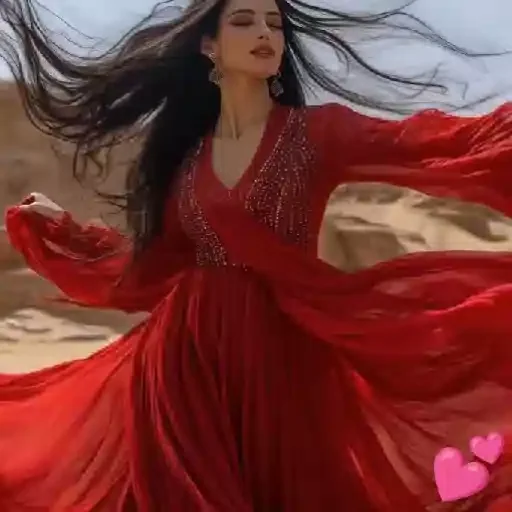 Mujer con vestido rojo y cabello al viento en un paisaje desértico con dos corazones rosas en la esquina inferior derecha.