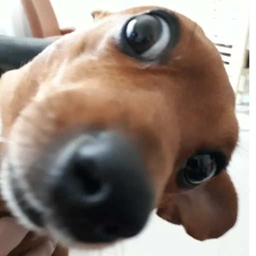 Cachorro com olhos arregalados e expressão surpresa, sentado em frente a um sofá laranja.