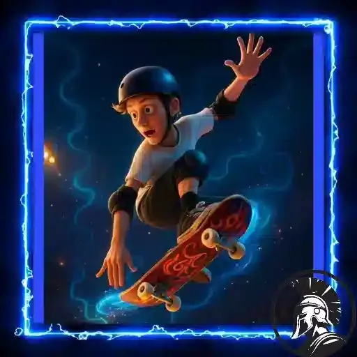 Niño en acción con patineta y marco de neón azul, usando casco y coderas, patineta naranja.