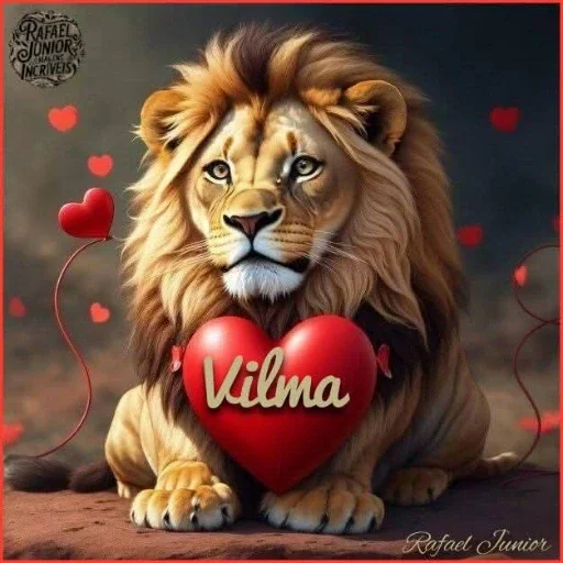Un león con una melena dorada y marrón mira hacia adelante con un corazón rojo delante. El corazón tiene el nombre 'Vilma' en letras doradas.
