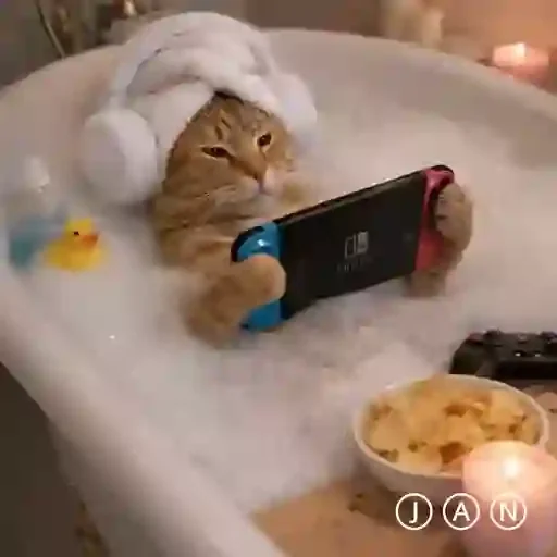 Gato relajado en una bañera con una toalla en la cabeza, sosteniendo un teléfono móvil y comiendo palomitas de maíz, junto a un pato de goma y velas encendidas.
