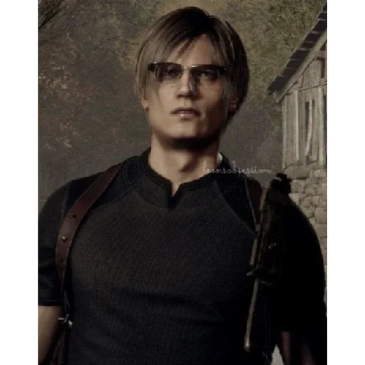 Personagem de jogo com cabelo loiro curto e expressão séria, vestindo roupas escuras.