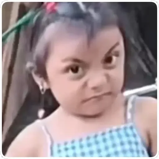 Niña pequeña con expresión seria, cabello oscuro y un vestido azul con cuadros. Parece tener una ligera insatisfacción en su rostro.