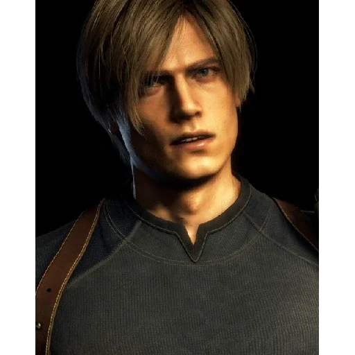 Personagem de jogo com cabelo loiro curto e expressão séria, vestindo uma camisa preta e alça de couro.