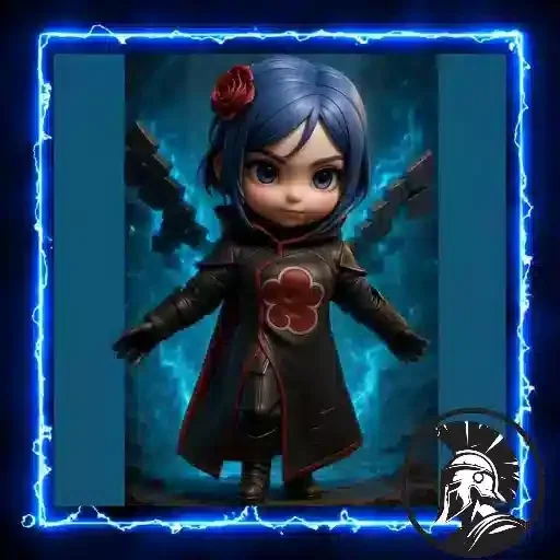 Un personaje de anime con cabello azul y un vestido negro, con un símbolo rojo en el pecho y un adorno rojo en el cabello, contra un fondo azul con efectos de luz.