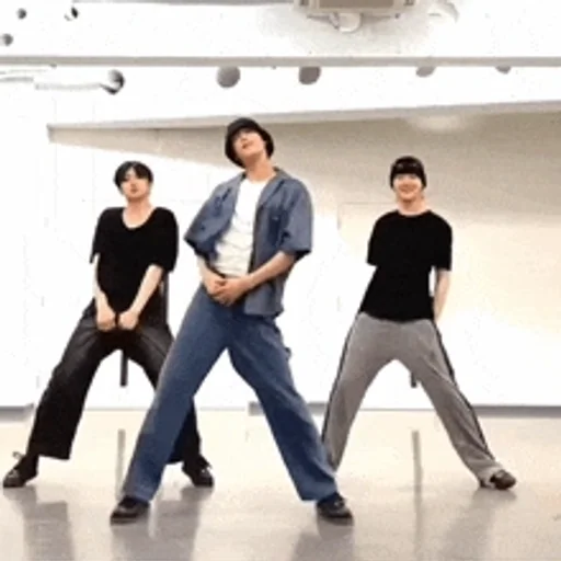 Tres jóvenes bailando en una habitación con ropa casual, fondo blanco.