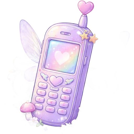 Un teléfono móvil púrpura con un corazón en la pantalla y decoraciones adorables, incluyendo alas y estrellas.