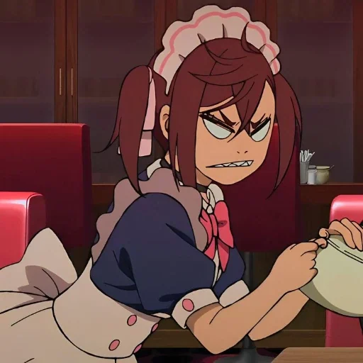 Una criada de anime con expresión enojada, sosteniendo una taza de té. Tiene cabello castaño y un gorro de criada rosa.