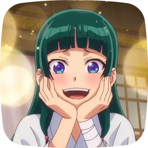 Una chica de anime con cabello verde y ojos morados, manos en el rostro y expresión sorprendida. Ella está usando un suéter blanco.