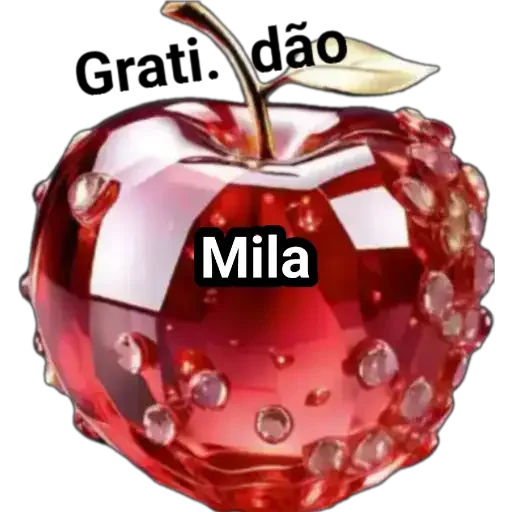 Una manzana roja brillante con gotas de agua, texto 'Grati. dão' y 'Mila' superpuesto.