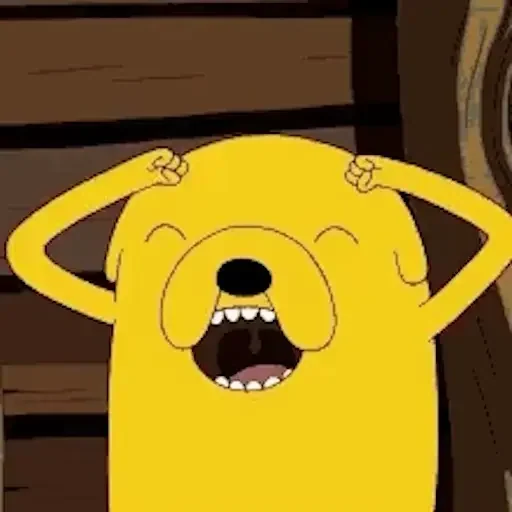 Um cão amarelo com expressão de estresse ou dor de cabeça, mãos na cabeça e olhos semicerrados. Fundo amarelo.