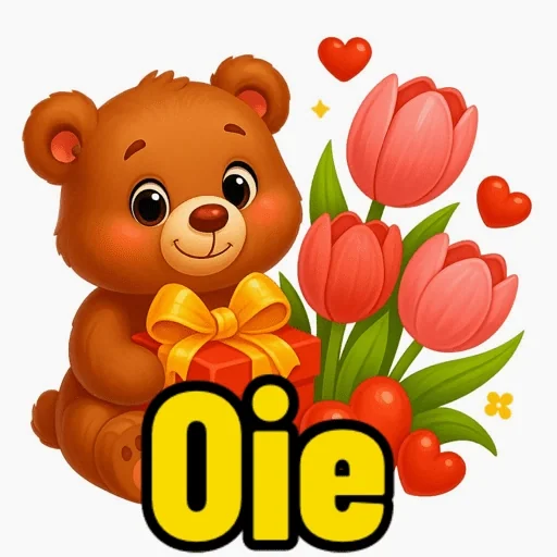 Un oso de peluche marrón con un regalo y flores rojas, con la palabra 'Oie' en letras grandes amarillas.
