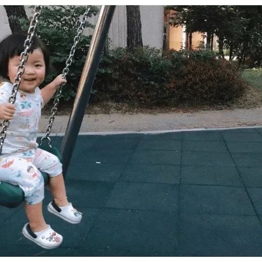 Niña sentada en un columpio, con un vestido blanco y pantalones estampados, con fondo de parque.