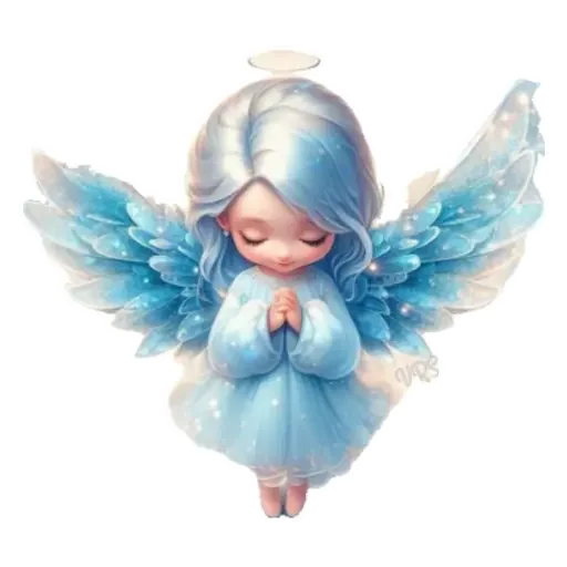 Una niña ángel de pelo azul con alas y halo, vestida con un vestido azul, manos juntas en oración y ojos cerrados.