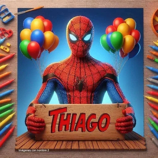 El hombre araña con ojos brillantes y traje rojo y azul, sosteniendo un letrero de madera con 'THIAGO' en letras rojas. Globos de colores en el fondo.