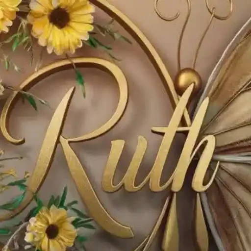 El nombre 'Ruth' en letras doradas cursivas, decorado con flores amarillas y hojas verdes sobre un fondo beige con detalles dorados.