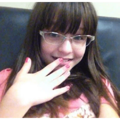 Niña con gafas y flequillo haciendo una cara, mano en la boca, uñas pintadas de rosa.
