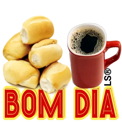 Pan francés apilado junto a una taza de café negro, con el texto 'BOM DIA' en letras grandes rojas.