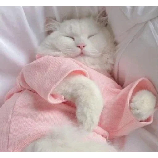 Gato blanco acostado de espaldas con un outfit rosa, pareciendo dormir o relajado.