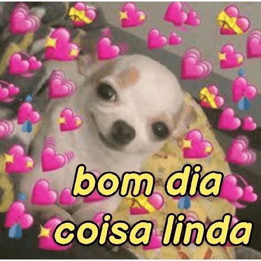 Un perro blanco con ojos grandes y negros, rodeado de corazones rosados y azules, con la frase 'bom dia coisa linda' en amarillo.