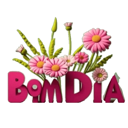 Un ramo de flores rosadas con el texto 'Bom Dia' en letras grandes y rosadas.