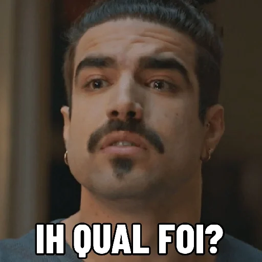 Un hombre con bigote y cejas fruncidas, mirando hacia arriba con una expresión de sorpresa o confusión. El texto 'IH QUAL FOI?' aparece en la parte inferior de la imagen.
