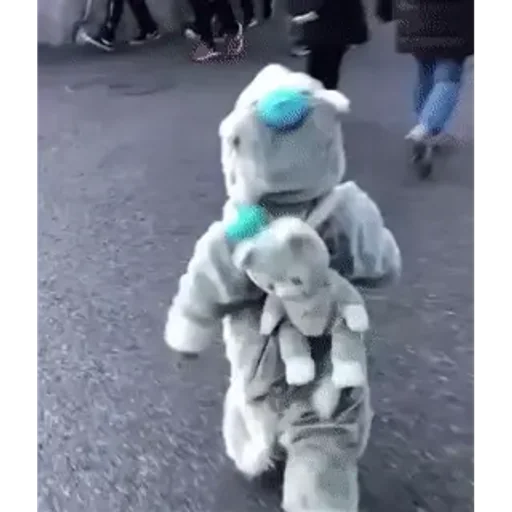 Um menino vestido com um macacão de urso puxado por uma corda anda em uma calçada de pedra.
