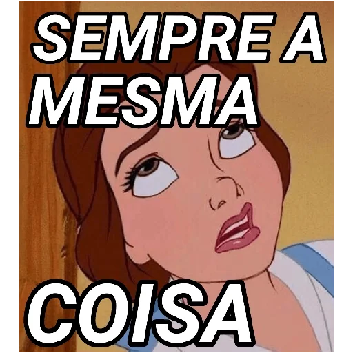Una imagen de la personaje Bella de 'La Bella y la Bestia' con una expresión de sorpresa y descontento. La imagen tiene el texto 'SEMPRE A MESMA COISA' superpuesto.