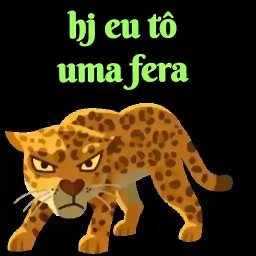 Un leopardo con manchas marrones y ojos amarillos, con expresión seria y postura agresiva. La imagen tiene el texto 'hj eu tô uma fera' en verde.