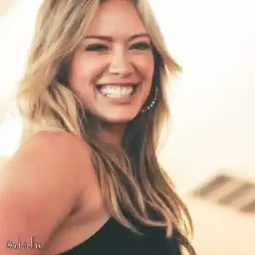 Una mujer joven con cabello rubio y una amplia sonrisa que muestra dientes blancos, usando un top negro. Ella tiene cabello ondulado y parece feliz.