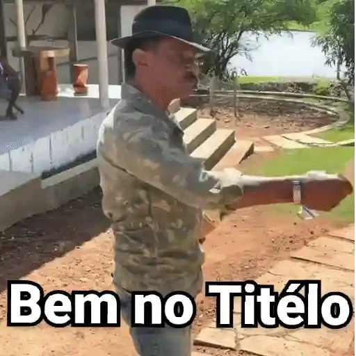 Um homem de camisa azul e bermuda preta pulando com os braços abertos em uma rua, com uma moto ao fundo. O texto 'Perdi…