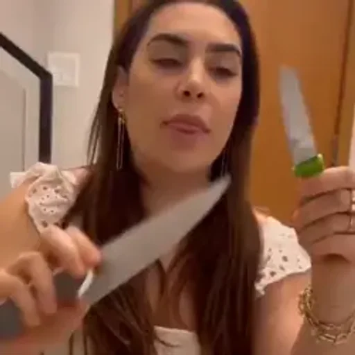Una mujer con cabello castaño y ojos castaños, con una expresión de sorpresa o preocupación, sostiene un cuchillo y un objeto verde en su mano.