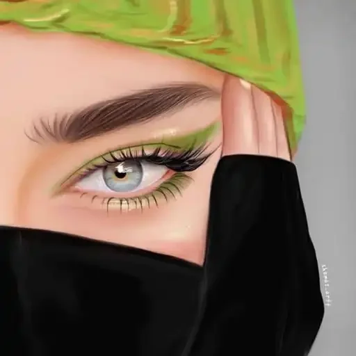 Ojo de una mujer con maquillaje colorido, ceja depilada y pestañas postizas. Ella lleva un pañuelo o gorro verde en la cabeza y un accesorio negro que cubre la parte inferior de su rostro.