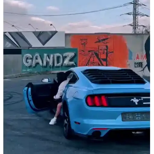Un coche azul con una mujer saliendo por la puerta, frente a una pared con grafitis coloridos. El coche tiene un logotipo de un caballo en un fondo negro.