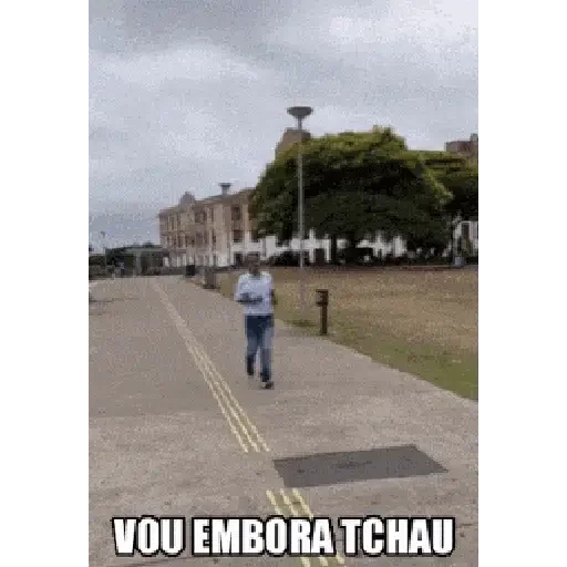 Un hombre de espaldas, con una camiseta azul y pantalones de jeans, caminando por una acera con la frase 'VOU EMBORA TCHAU' destacada en la parte inferior.