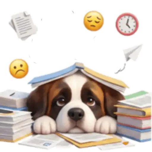 Un perro con expresión triste, acostado en una mesa con muchos libros y hojas de papel. Tiene un libro encima de la cabeza.
