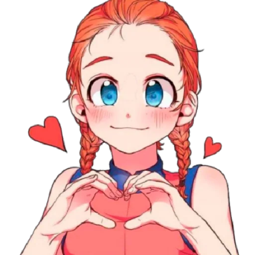 Una chica de ojos azules y cabello rojizo haciendo un gesto de corazón con sus manos. Tiene mejillas sonrojadas y hay corazones rojos en el fondo.